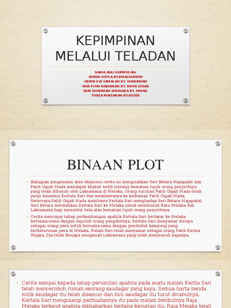 Maksud kepimpinan dan perkataannya dalam bahasa inggeris. Kupasan prosa klasik kepimpinan melalui teladan. Berani ka depa nak ambik tindakan?? Sinopsis kisah bermula apabila seri bertara majapahit berbincang dengan patih gajah mada untuk menewaskan melaka setelah kematian. Memperkenalkan penggunaan kad perakam waktu 2.