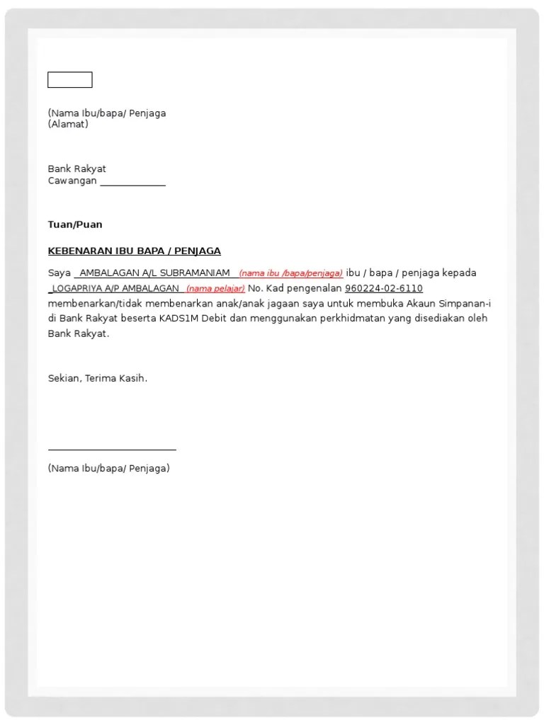 Surat Kebenaran Ibu Bapa Bank Rakyat / Surat kebenaran ibu bapa/penjaga menyertai program anjuran kolej universiti islam melaka (kuim).
