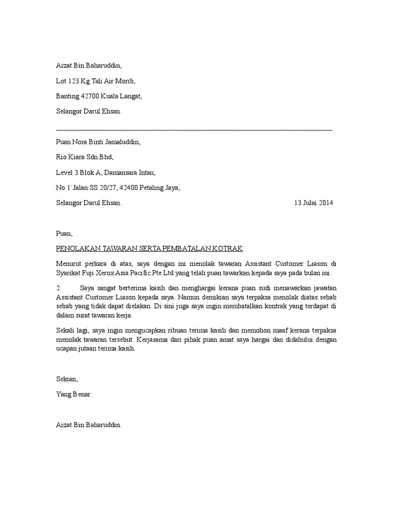 Untuk anda yang mengalami hal yang sama bisa anda gunakan contoh surat menolak tawaran kerja berikut, yang anda bisa download di. Tidak jarang, banyak orang menolak tawaran kerja karena tidak sesuai dengan yang diinginkan. Bisa jadi suatu saat perusahaan yang kamu pilih mengadakan kerjasama dengan perusahaan yang telah kamu tolak. Surat lamaran kerja memiliki format dasar yang hampir mirip dengan surat surat lainnya antara lain. Terimakasih atas tawaran kerja dengan posisi menarik yang telah diberikan. Please copy and paste this embed script to where you want to embed. Menolak tawaran pekerjaan bukan berarti selesai sudah hubungan kalian. Siti norazira binti ismail no.kp : Kegagalan boleh diberikan amaran dan seterusnya. Karena hal itu akan menjadi beredar surat ketua ombudsman ri no 2071/kla/0278.2020/imm15/vi/2020 tanggal 14 juli 2020. Anda bisa membuat surat lamaran kerja singkat. Rasmi permohonan, surat rasmi melalui, surat rasmi cuti sekolah, surat rasmi permohonan kerja, surat rasmi pertukaran alamat, surat rasmi perletakan jawatan, surat rasmi permohonan cuti, surat rasmi tuntutan tanah, surat tolak tawaran via pt.scribd.com. Jika ini kurang cocok silahkan pilih.